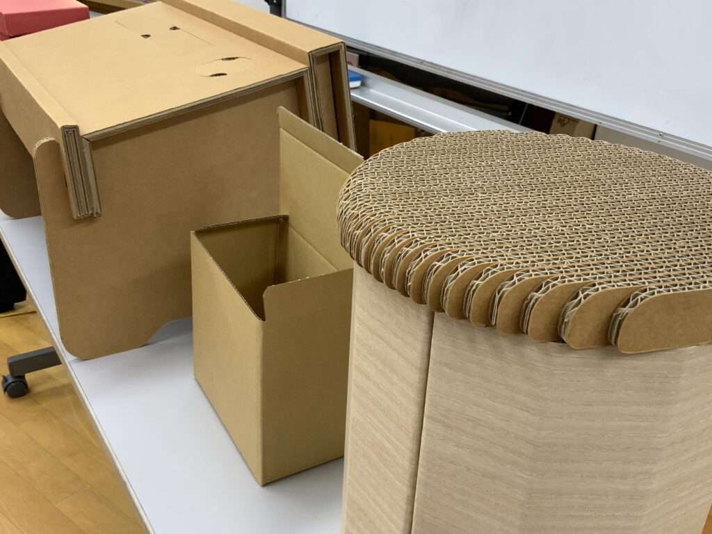 さらに、強化ダンボールを実際に手に取ってもらうと、「こんな固いダンボールを触るのは初めて!」という声も。子どもたちからは「こんなものは作れますか?」といった面白いアイデアや質問が次々に出てきて、ものづくりの可能性を感じる時間になりました。